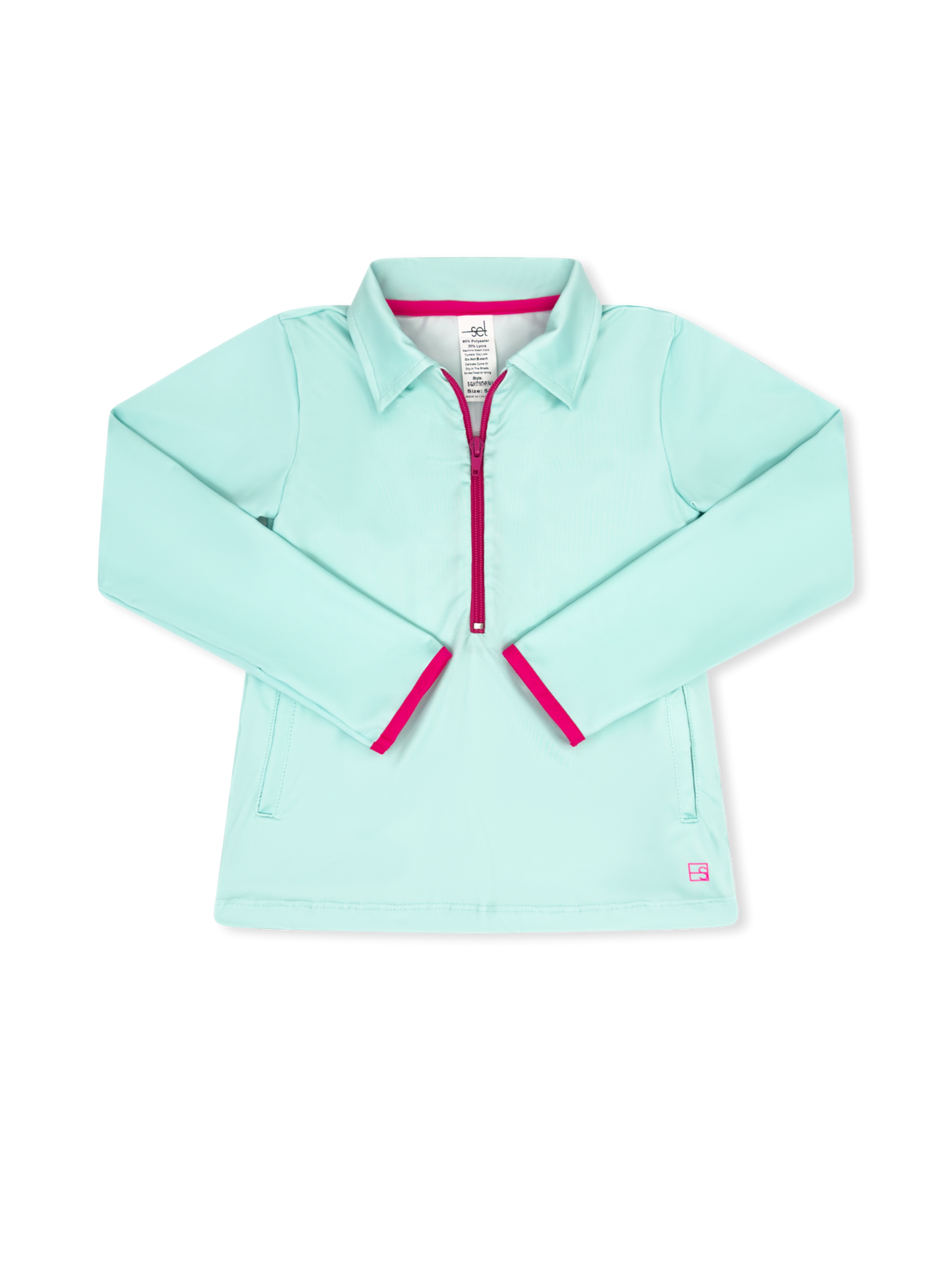 The Heather Half Zip is the perfect layering piece for those cooler days. The lightweight athleisure fabric in Cool Mint with Power Pink zipper and welting is the ideal pairing for lots of great mix-and-match options.
