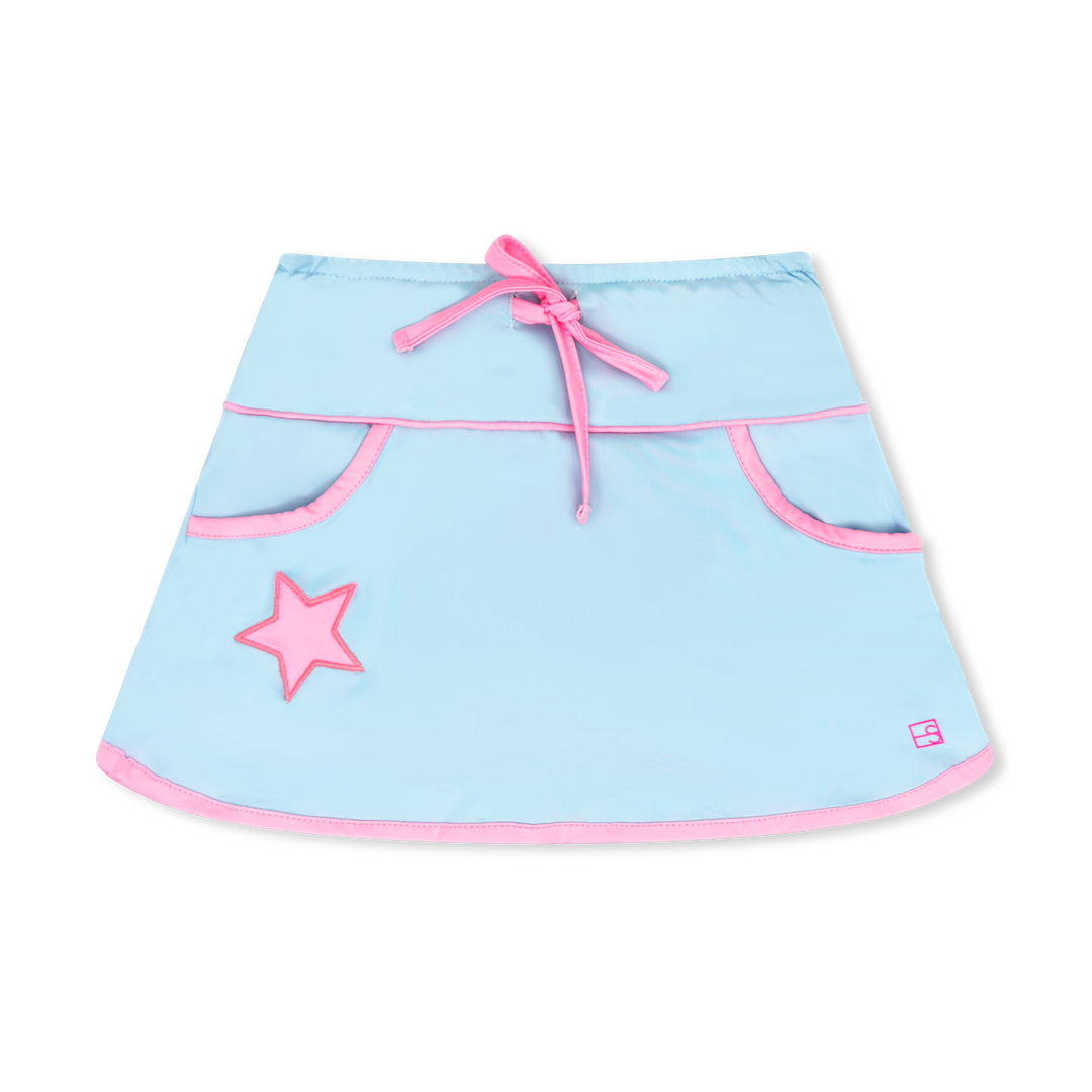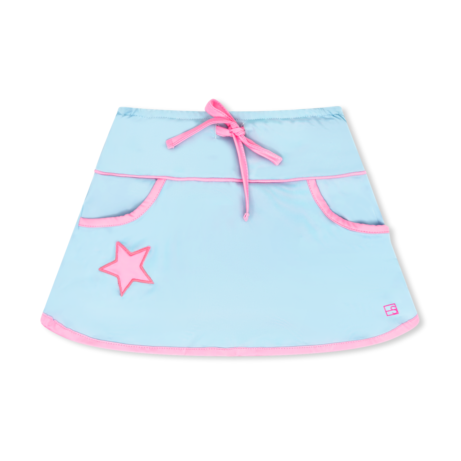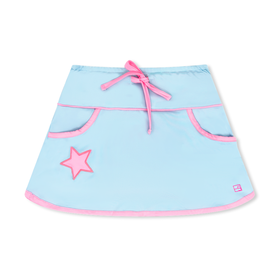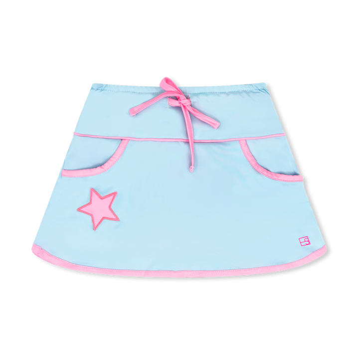 Your little girl will love the Tiffany Skort in Cotton Candy Blue with Flamingo Pink piping, tie, and built-in shorts. This skort, with its playful star applique, is perfect for sunny days and sporty adventures.