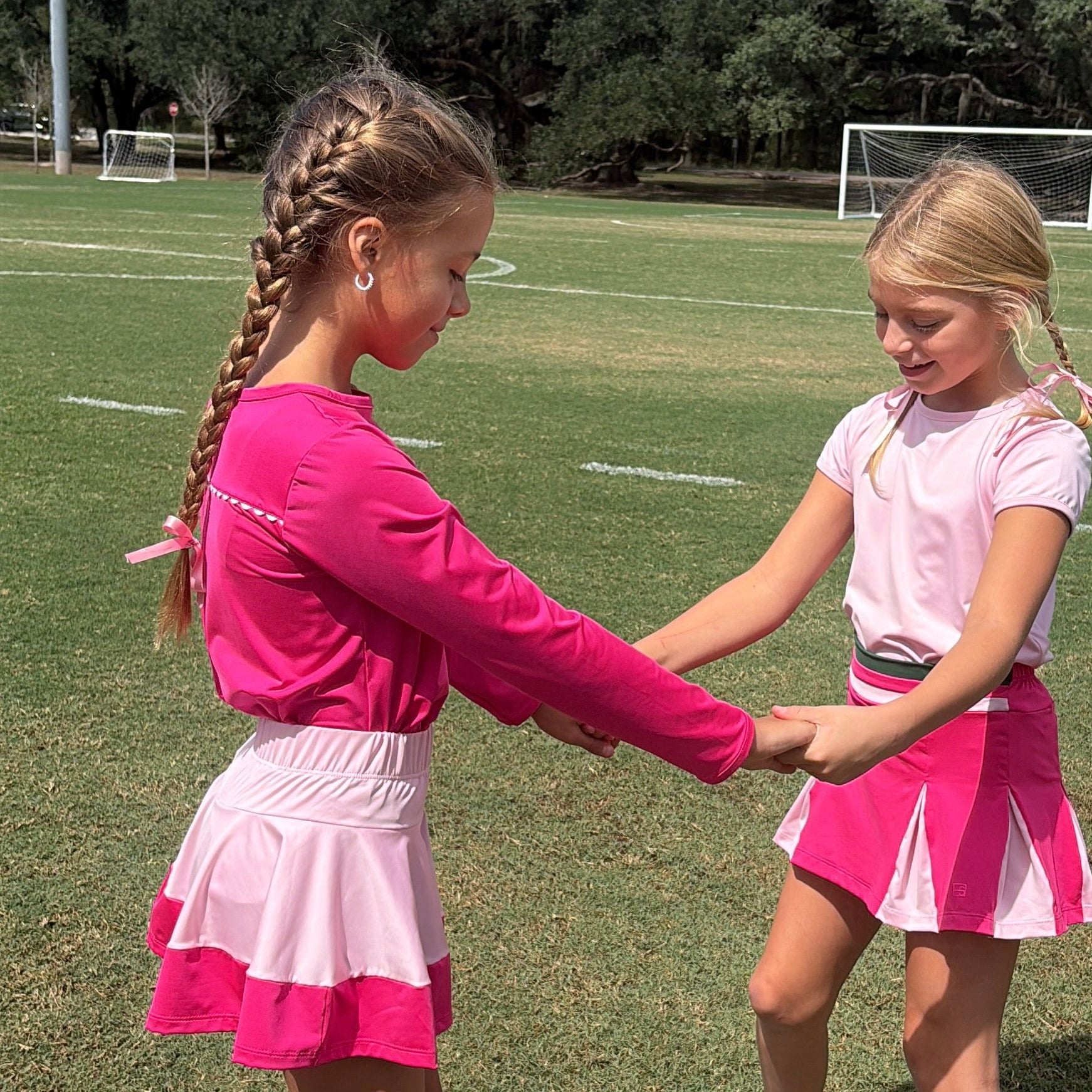 Our Taylor Long Sleeve Tee is a longer style with a cute pleat down the back. This Power Pink athleisure top with Totally Turquoise ric rac is designed to go back with our leggings.