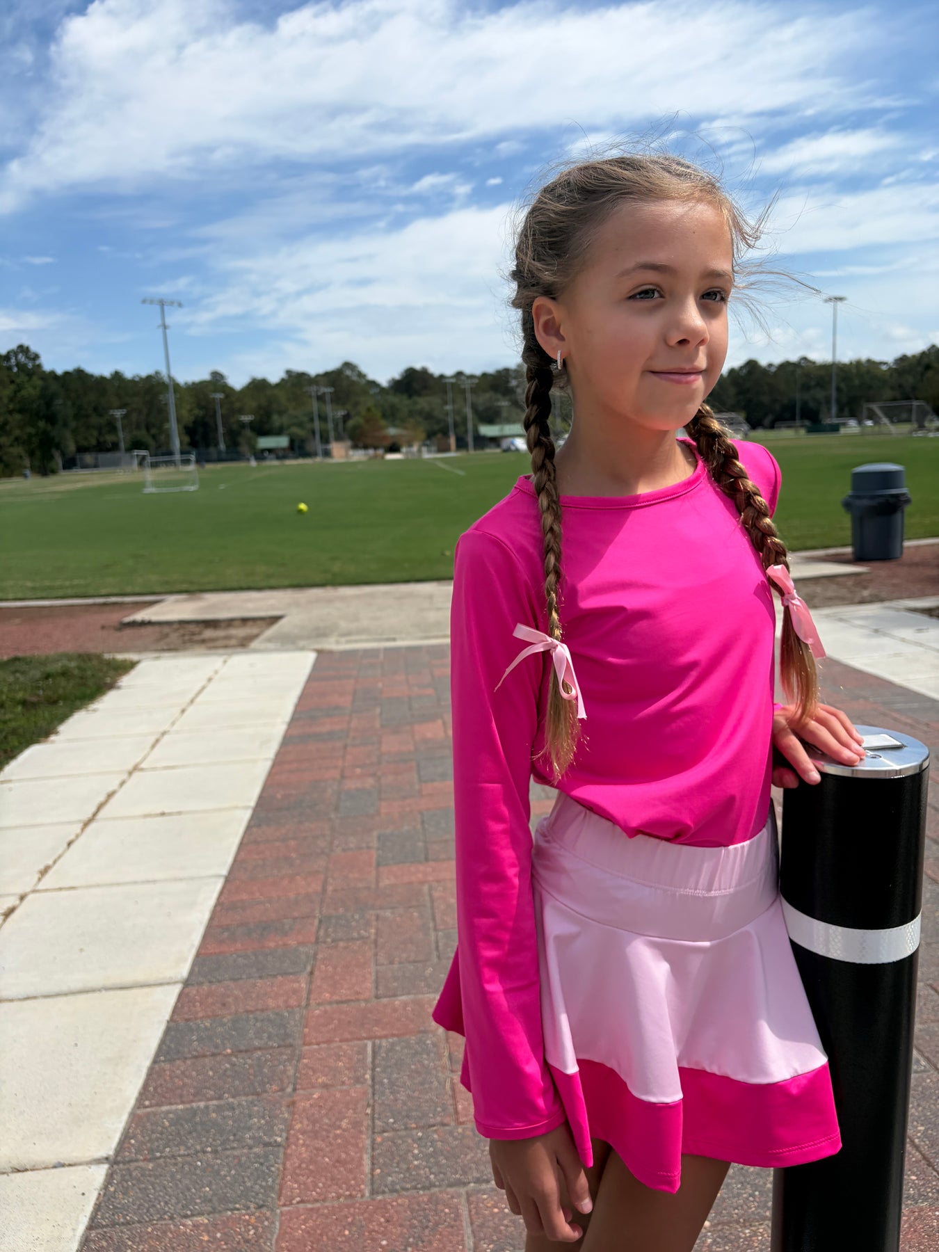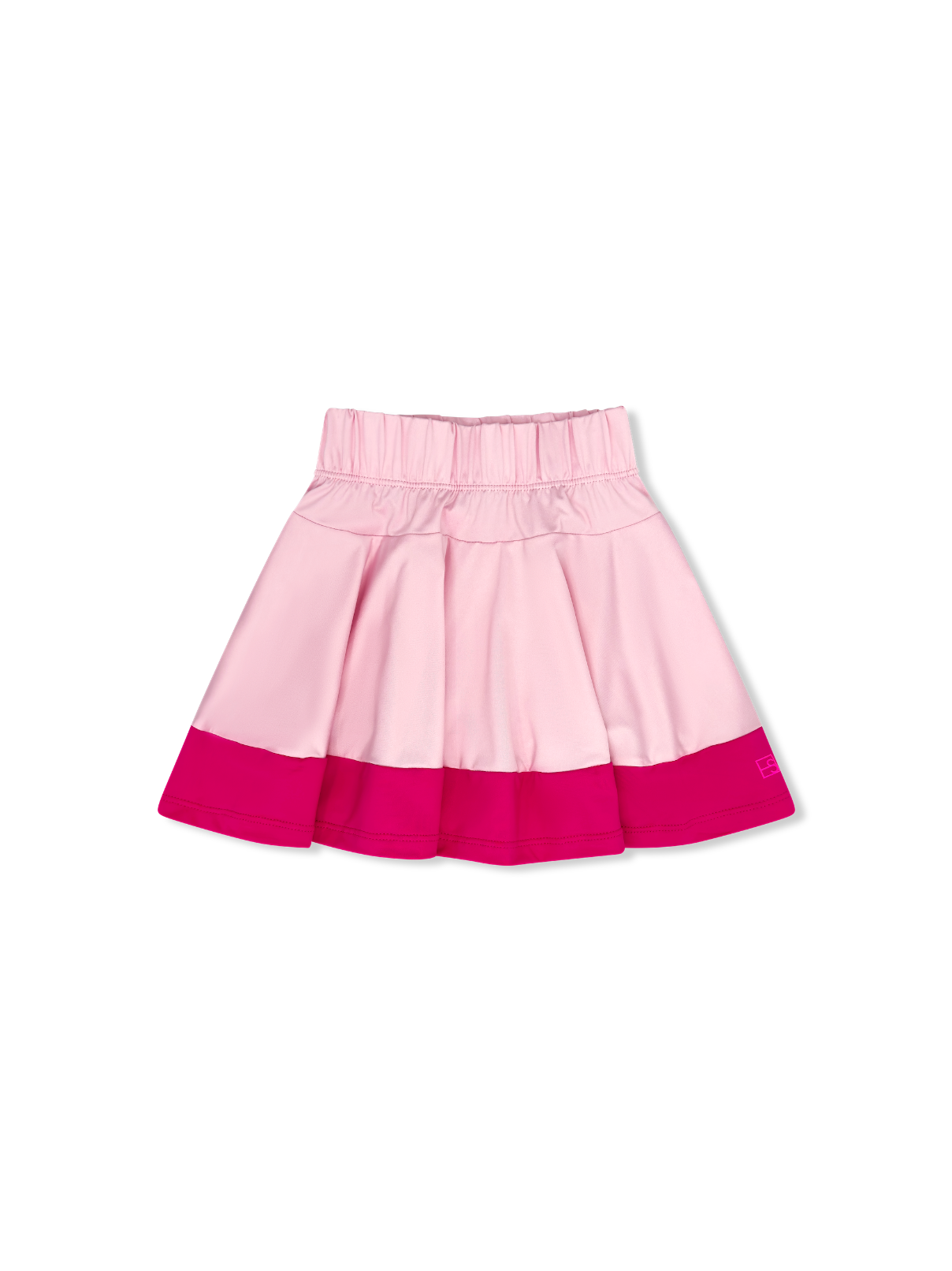 The Amber Skort is back in a color block Cotton Candy Pink and Power Pink athleisure with built-in shorts. This skort is both country club and tennis-loving approved!