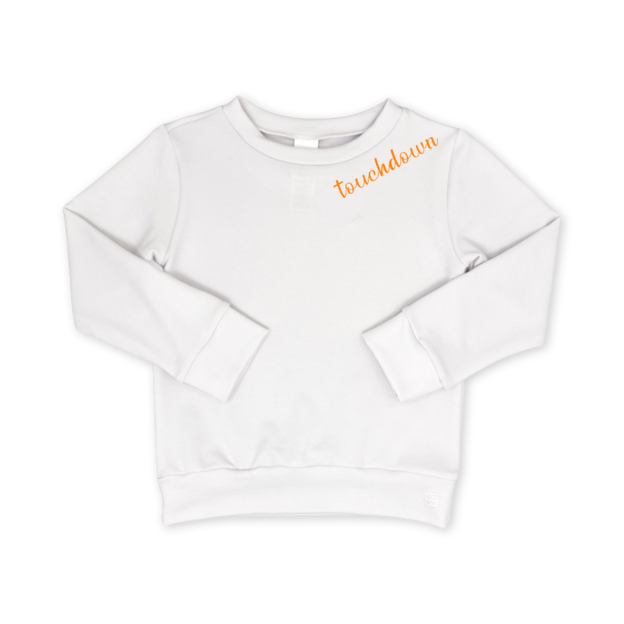 Our new Alex Sweatshirt is perfect for game day. This soft and cozy sweatshirt in Pure Coconut with touchdown embroidered in orange brings team spirit to a new level. Pair with our Tiffany Skort in Dreamsicle Orange Gingham to complete the look.