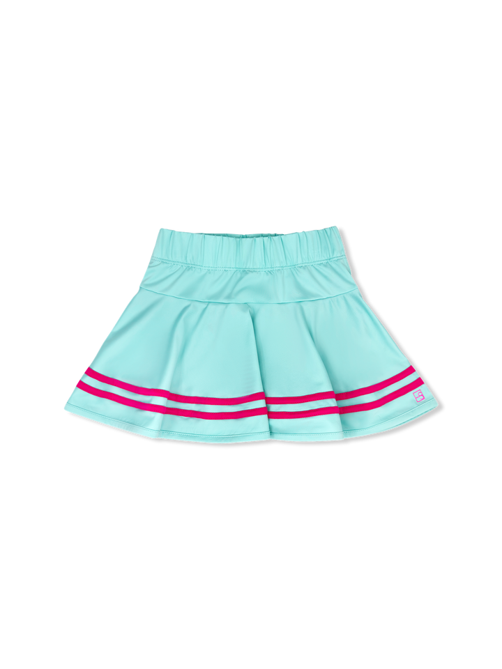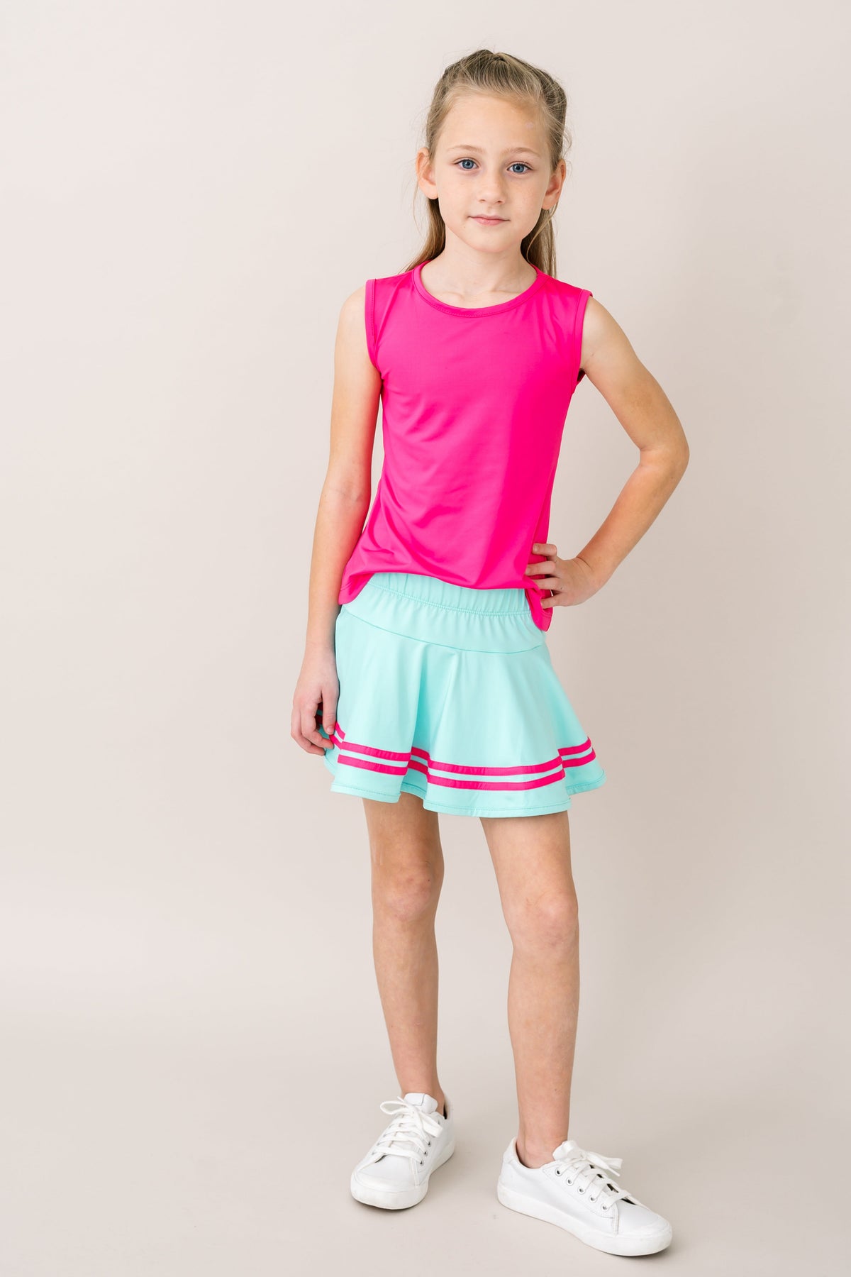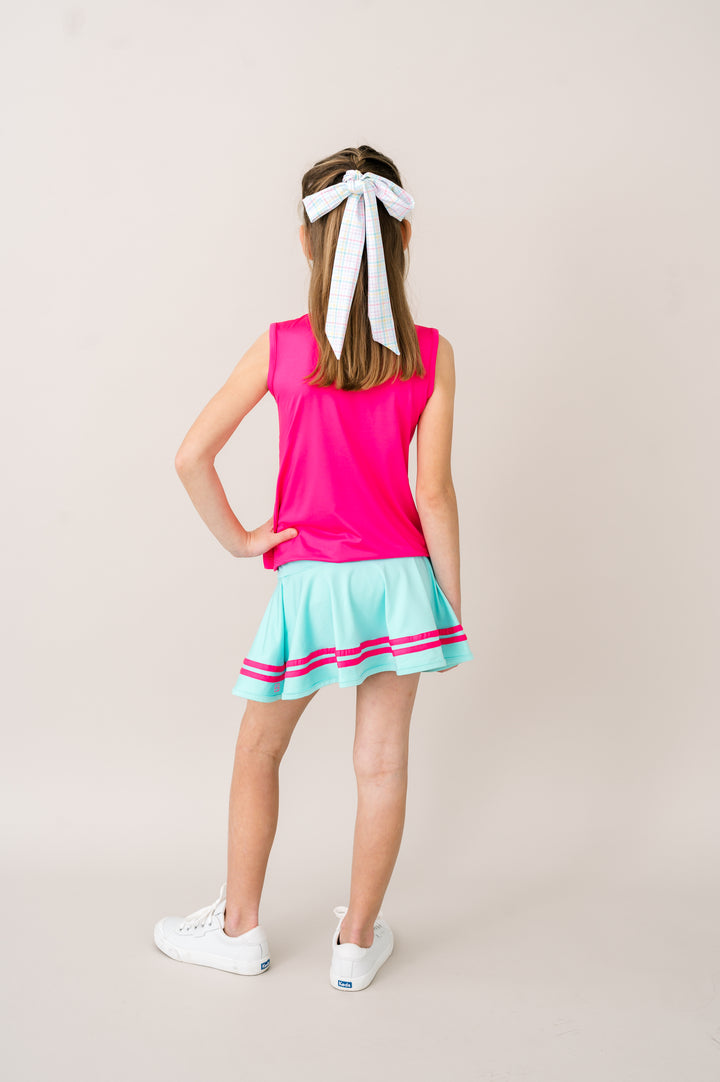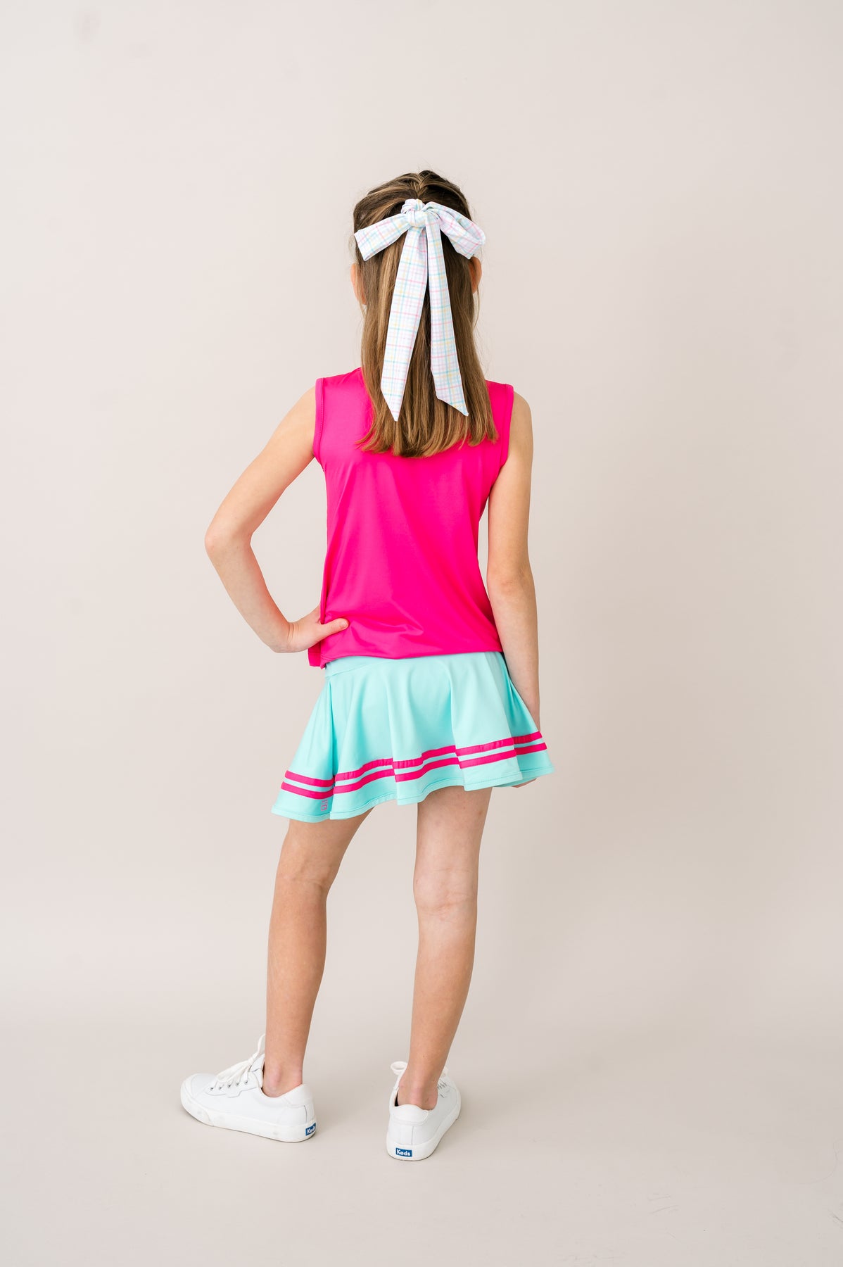 Our Callie Skort is back and will be one of her favorites. This Totally Turquoise skort in athleisure fabric with Power Pink welting and built-in shorts will make her the best-dressed girl for all her tennis matches.
