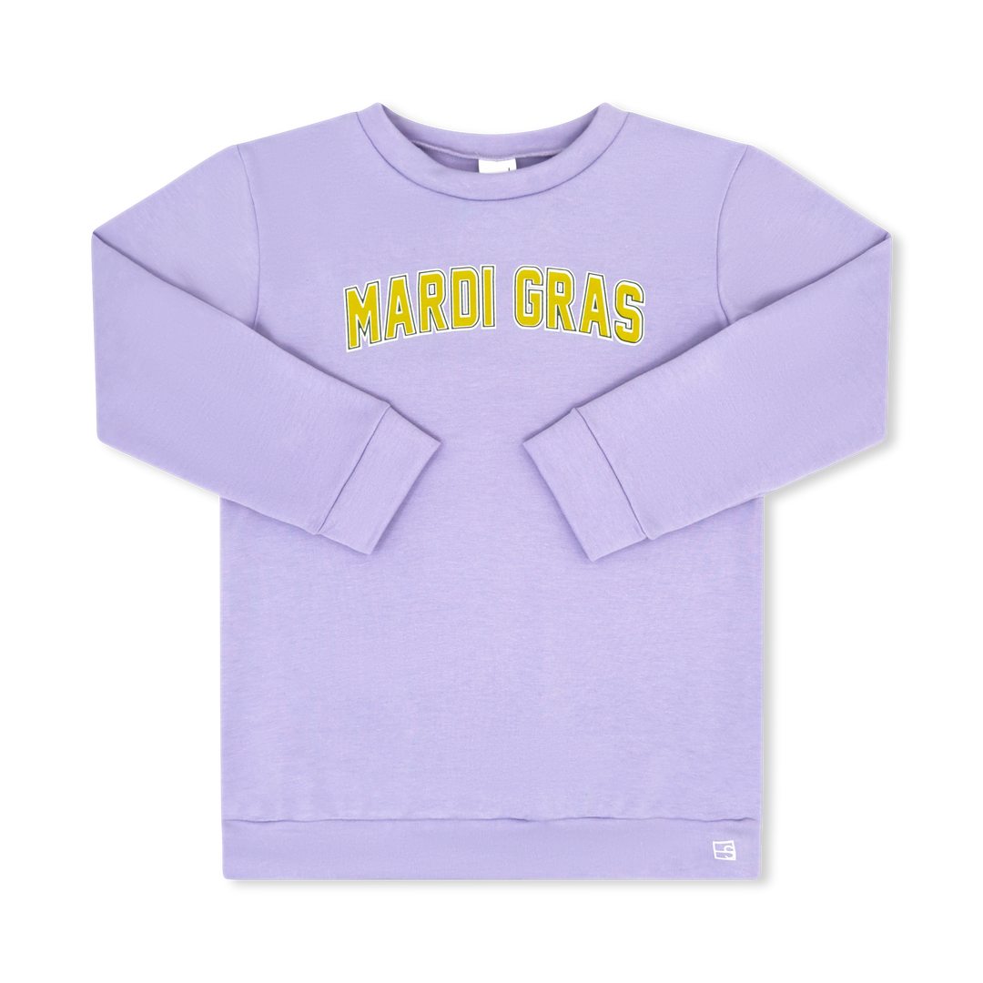 Our Emma Sweatshirt is perfect for those cooler days. This soft and cozy sweatshirt in Petal Purple with a fun Mardi Gras graphic. It is a longer-style sweatshirt that pairs perfectly with our leggings.