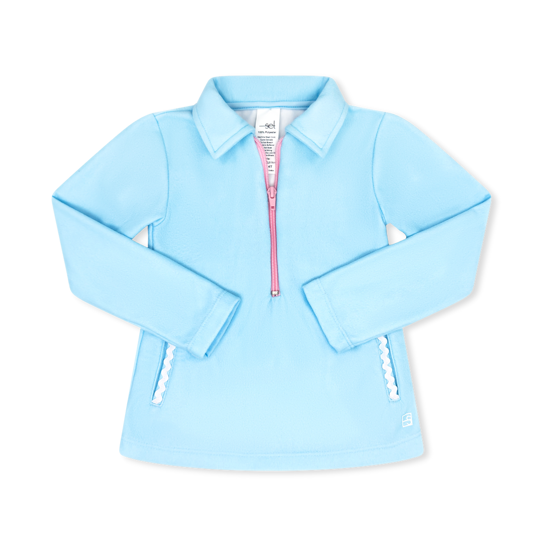 The Heather Half Zip is the perfect layering piece for those cooler days. The cozy fleece fabric in Cotton Candy Blue with Flamingo Pink Zipper and Pure Coconut ric rac is ideal for great mix-and-match options.