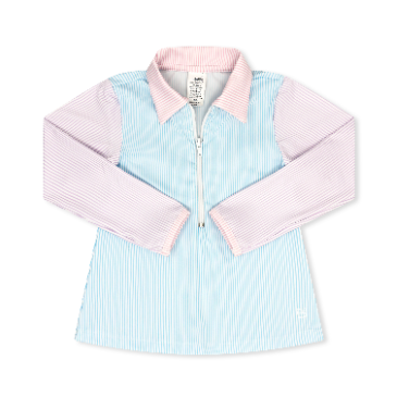 The Heather Half Zip is the perfect layering piece for those cooler days. The lightweight athleisure fabric in Cotton Candy Blue Ministripe with Petal Purple and Cotton Candy Pink welting and collar is ideal for great mix-and-match options.