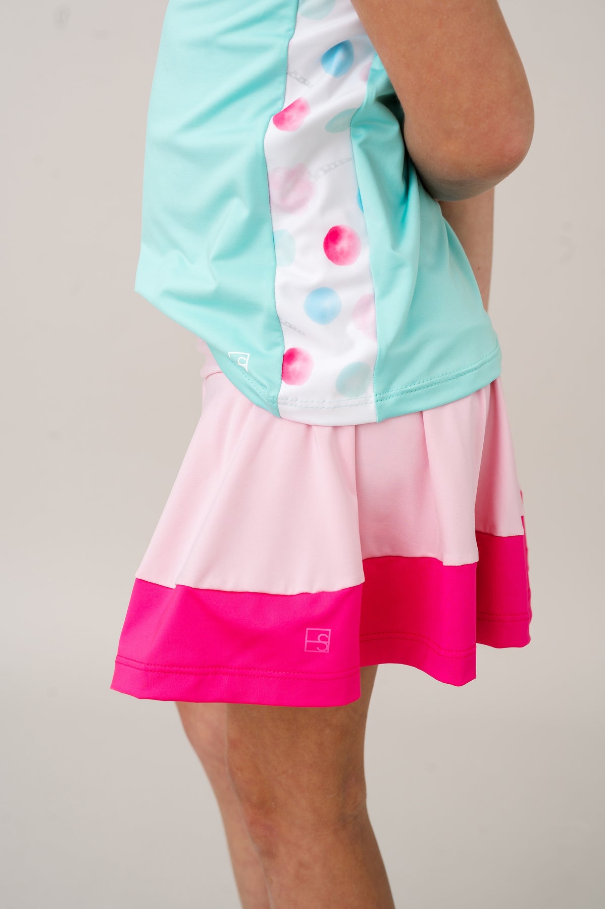 The Maddy Tank in Totally Turquoise is a fun and sporty essential, featuring Petal Purple welting and The Sweet Life print on the sides for a playful touch. Perfect for active days, this tank combines comfort and style for a vibrant, everyday look.