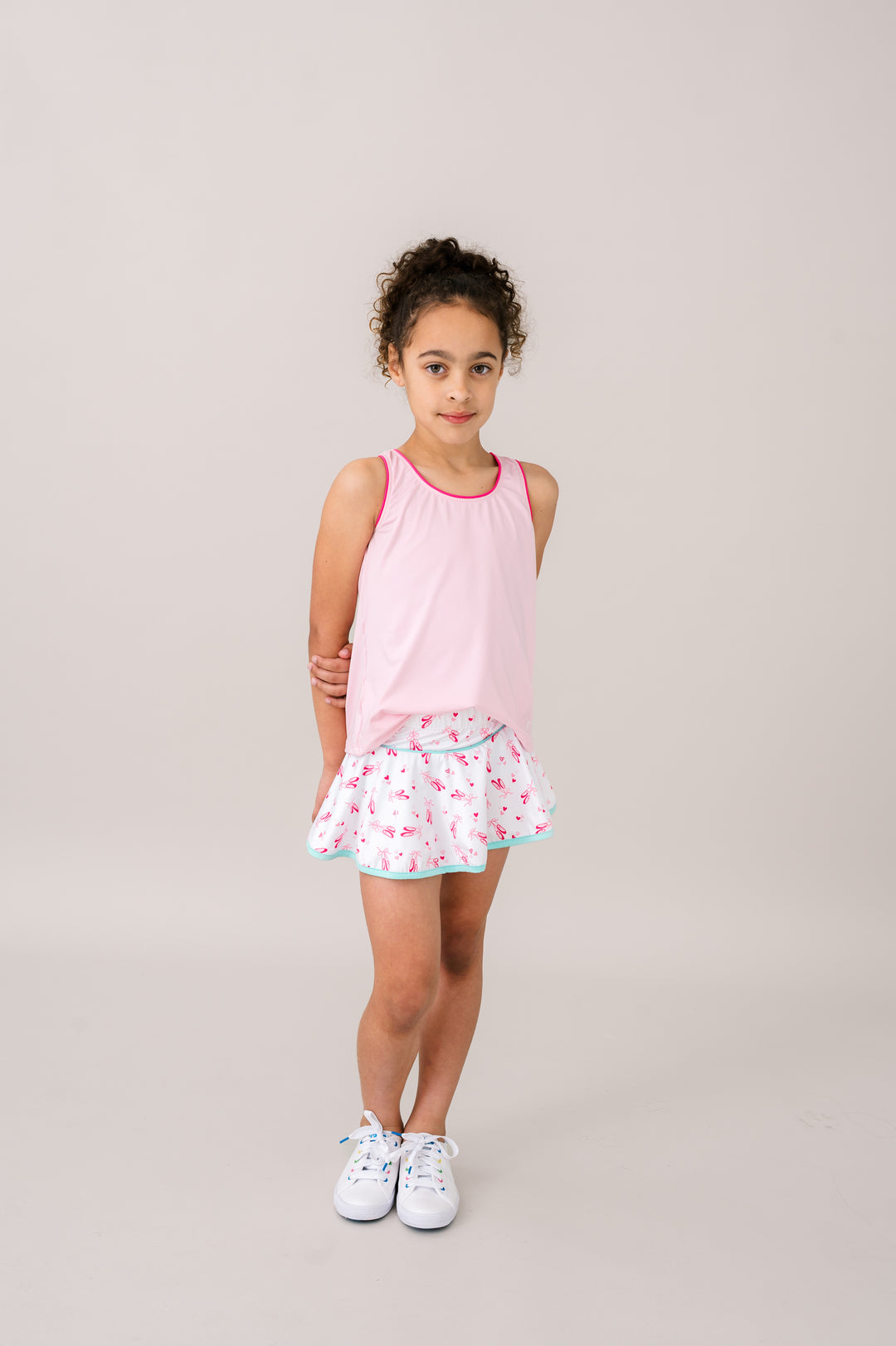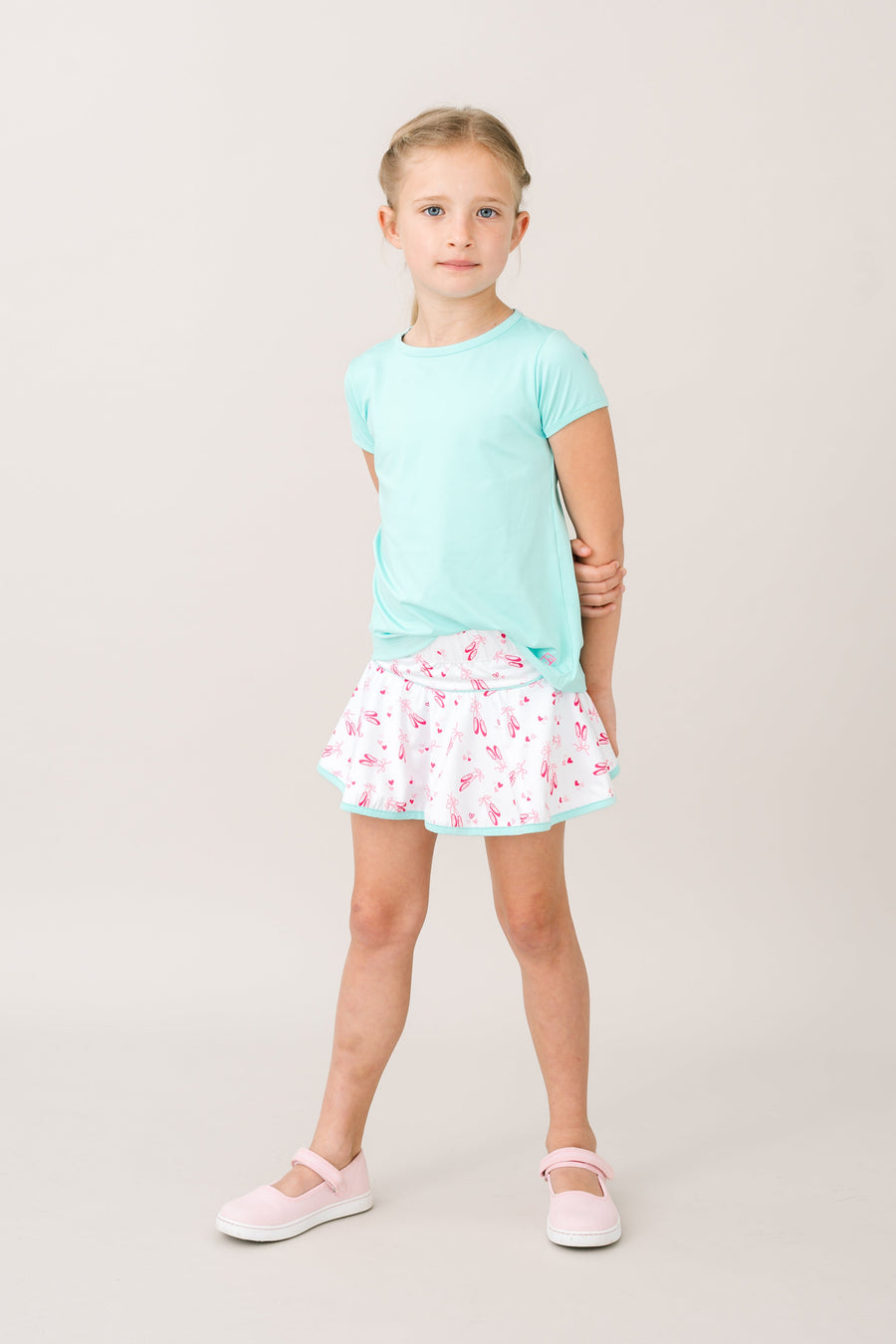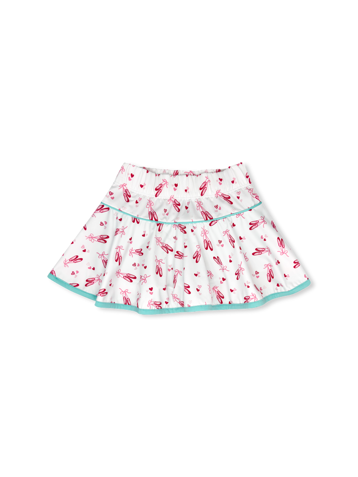 Our best-selling Quinn Skort in our Tiny Dancer print Totally Turquoise welting is country club and tennis-loving approved! Pair it with any of our tees or pullovers for the perfect look.
