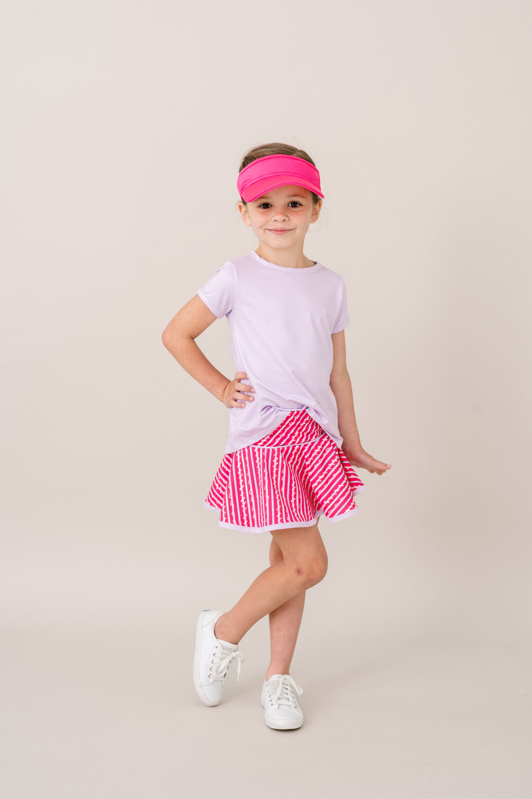 Our best-selling Quinn Skort in Wiggles and Giggles print athleisure with Petal Purple welting and built-in shorts is country club and tennis-loving approved! Pair it with any of our tees or pullovers for the perfect look.